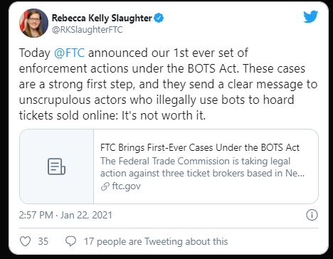 Today Rebecca Kelly Slaughter posted about the FTC’s first SET of enforcement actions, telling criminals who use BOTS to hoard tickets that their time is numbered, and this is only the beginning of the end.