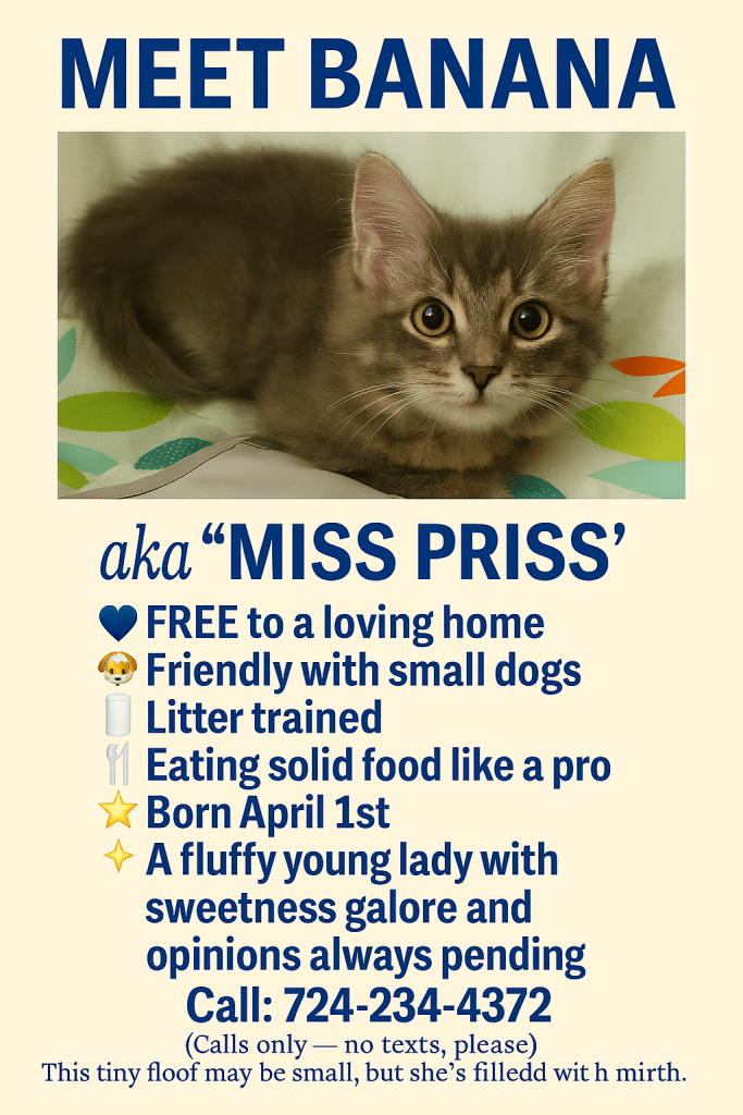 Whether she’s pouncing through her “first semester” of kittenhood or curling up with a scholarly stare, Pepper is both valedictorian of the litter and queen of our hearts. She’s staying right here where she belongs—with us.