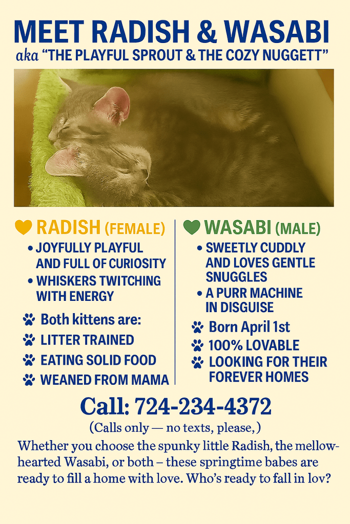 This is her first litter, and what a beautiful story they carry—every purr a promise, every tiny paw a legacy of healing. Ghost, Banana, Radish, and Wasabi didn’t just arrive into the world; they arrived into love—nurtured in warmth, play, and kindness by a momma who once needed all the same.